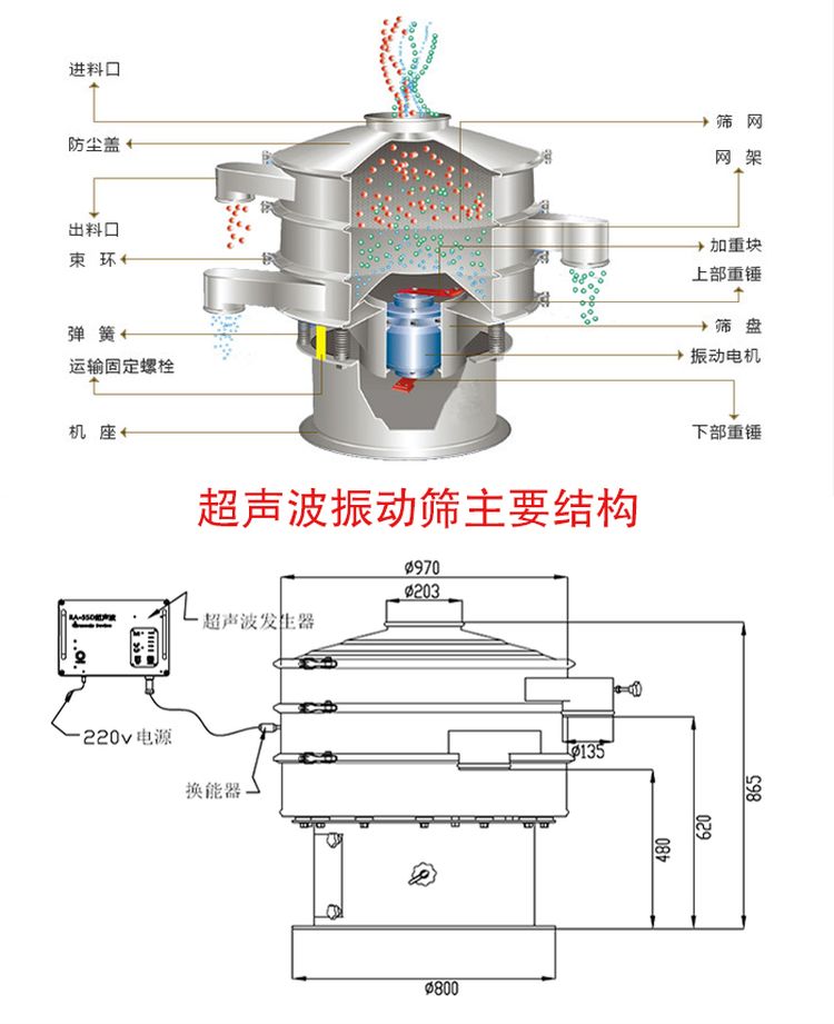 超聲波振動篩主要由換能器、超聲波電源、振動電機、減震彈簧、防塵蓋等部分組成。超聲波振動篩可將各種常用的低頻電能轉(zhuǎn)化為高達38KHz的高頻電能,再通過超聲換能器,zui終得到一個38KHz機械振動,既能夠提高篩分精度,又可以減少物料的堵網(wǎng)現(xiàn)象。