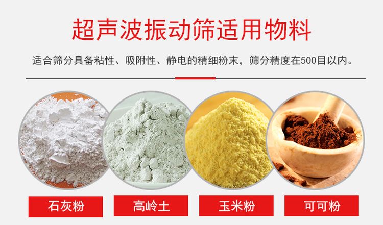 由于超聲波振動篩加裝了超聲波篩分系統(tǒng),適合篩分具備粘性、吸附性、靜電的精細粉末,篩分精度在500目以內(nèi),所以在篩分比較細的物料超聲波振動篩的還是站具很大得優(yōu)勢。