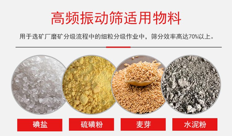 而高頻振動篩用于選礦廠磨礦分級流程中的細粒分級作業(yè),在適當?shù)慕o料濃度、給料粒度(-200目粒級含量)、以及需求篩下粒度與給料粒度之差小于30個百分點的條件下,篩分效率高達70%以上。