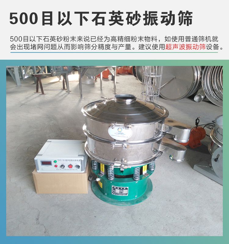對于500目以下石英砂粉末來說已經(jīng)為高精細(xì)粉末物料,如使用普通篩機(jī)就會出現(xiàn)堵網(wǎng)問題從而影響篩分精度與產(chǎn)量。對于該類型的石英砂產(chǎn)品就需要使用到另一款篩分設(shè)備-超聲波振動篩。該系列篩機(jī)的清網(wǎng)裝置使用的是超聲波系統(tǒng),開啟后篩面會形成一個高頻低振幅的超聲振動波,使高精細(xì)粉末低空懸浮在篩面粗從而實現(xiàn)清網(wǎng)及解決堵網(wǎng)問題。