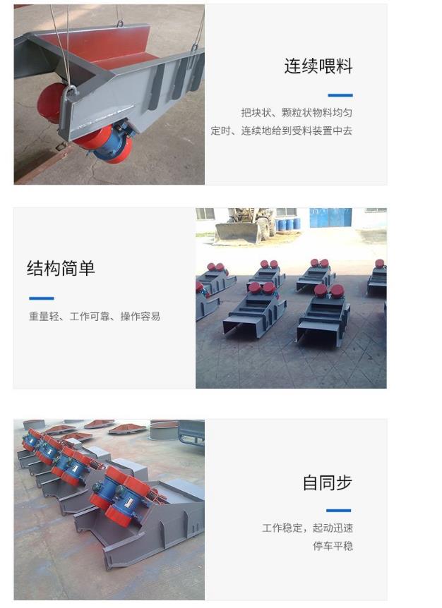 3、該機結(jié)構(gòu)簡單,振動平穩(wěn),喂料均勻,連續(xù)性能好,激振力可調(diào);隨時改變和控制流量,操作方便;偏心塊為激振源,噪音低,耗電少,調(diào)節(jié)性能好,無沖料現(xiàn)象;若采用封閉式機身可防止粉塵污染。