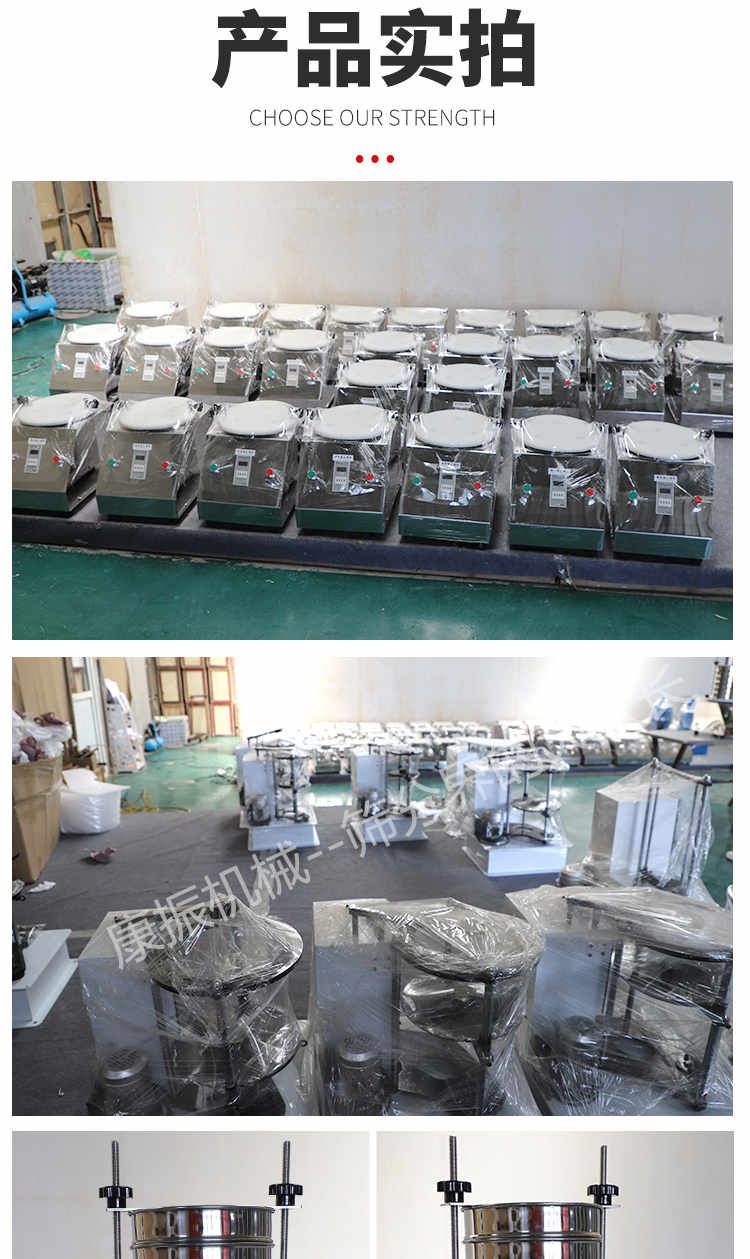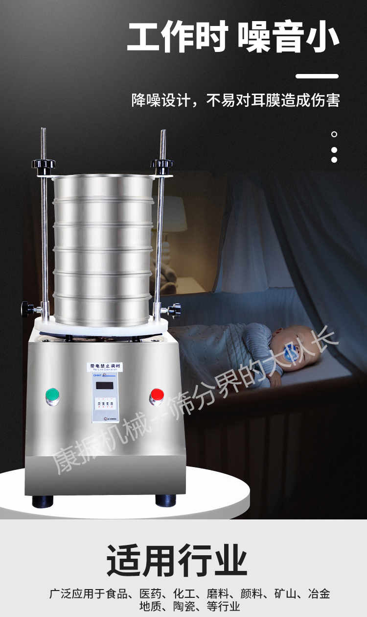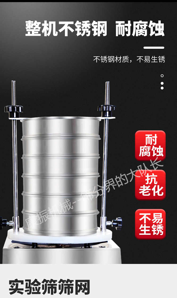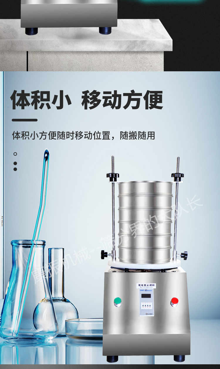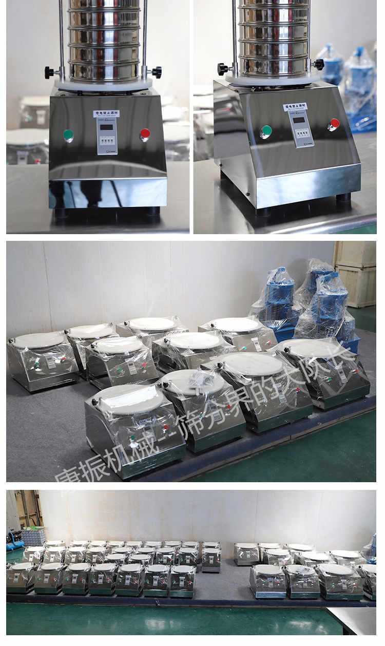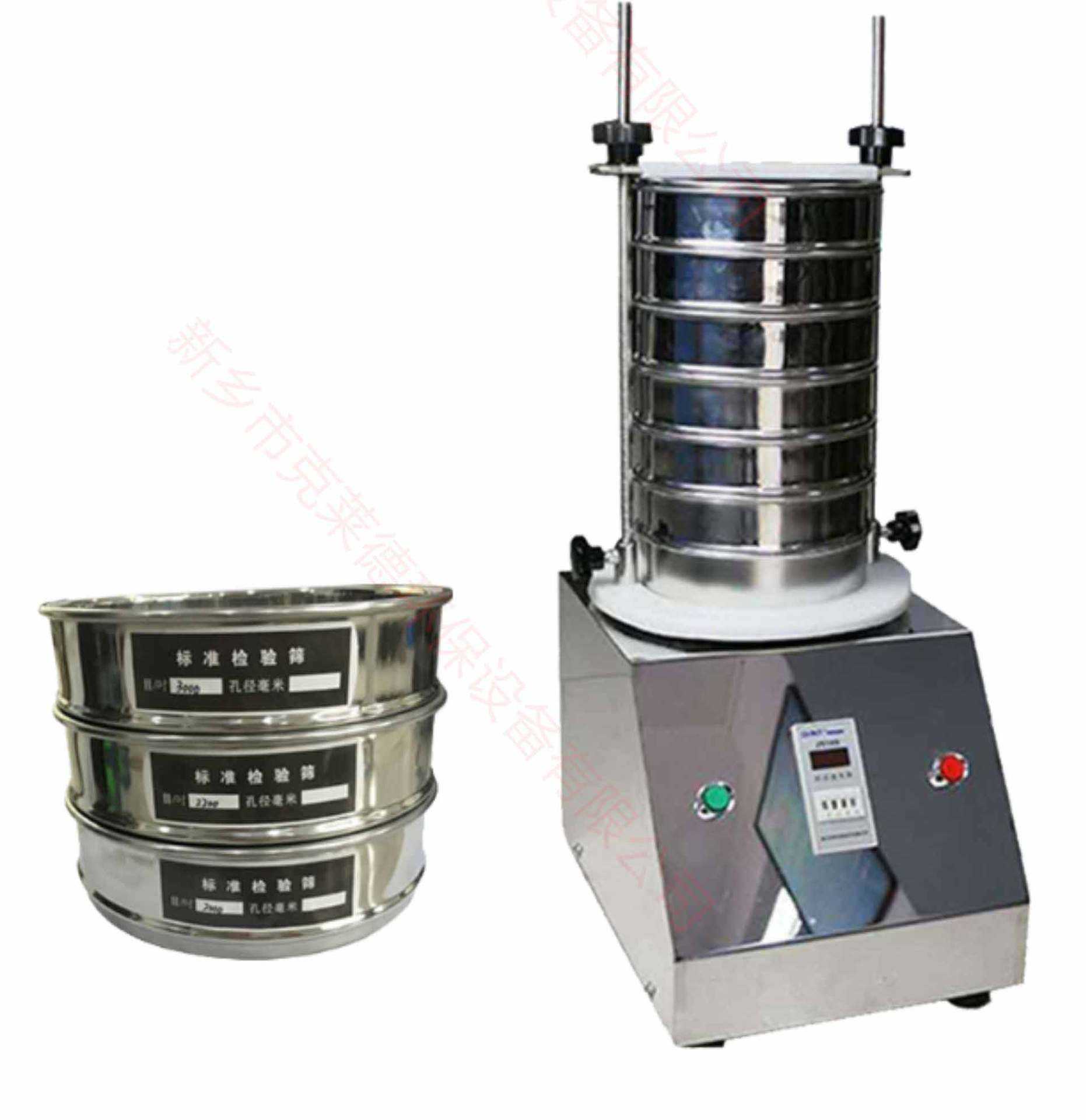 “機械篩分”將篩子按孔徑大小疊在一起,給料放在頂上一層篩子上,并加上蓋和底盤,一般疊5~6個篩子。然后放在機械振篩器上進行機械振動篩分。通常,振動時間為20分鐘。檢測篩分質量時,再用振篩器振篩器振篩5分鐘,如每分鐘篩下量小于0.2%試驗樣量即為合格,對于粗粒物料,過篩率小于1%即可。如篩分過程中損失量超過總篩分量的0.5%時,試驗必須重新取樣進行。為避免損失和延長篩分時間,有時在開始篩分時先用細的篩子將粉塵篩除