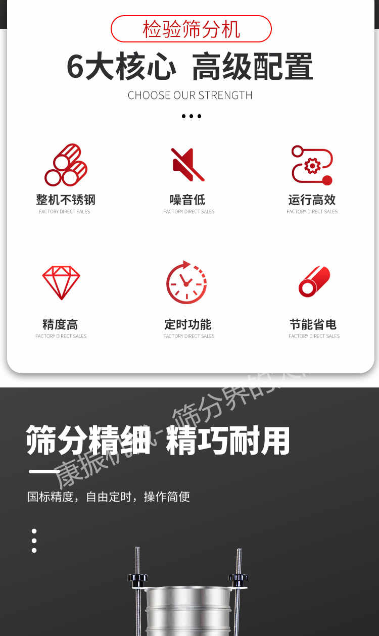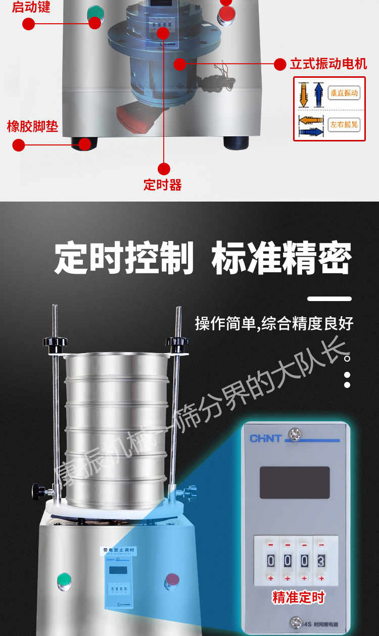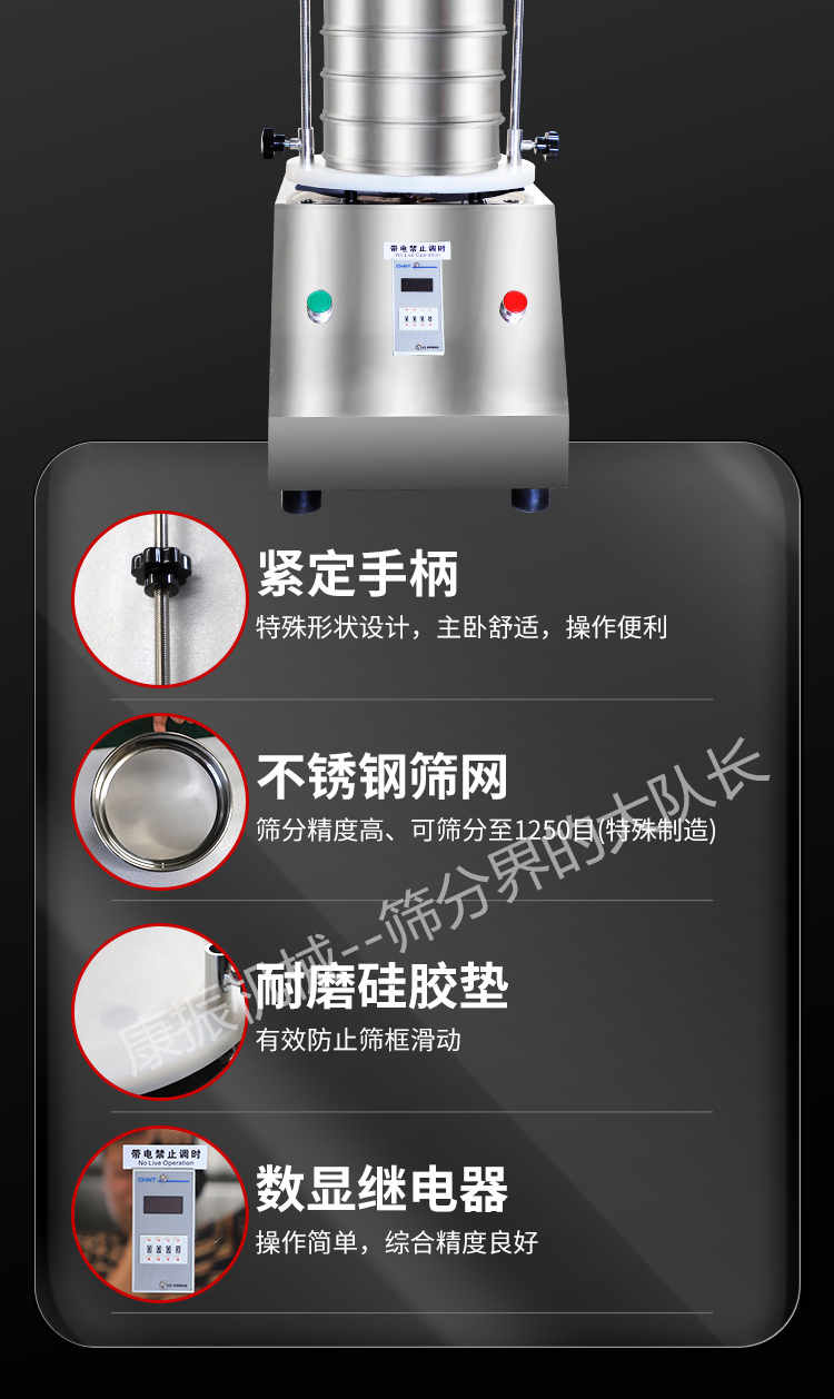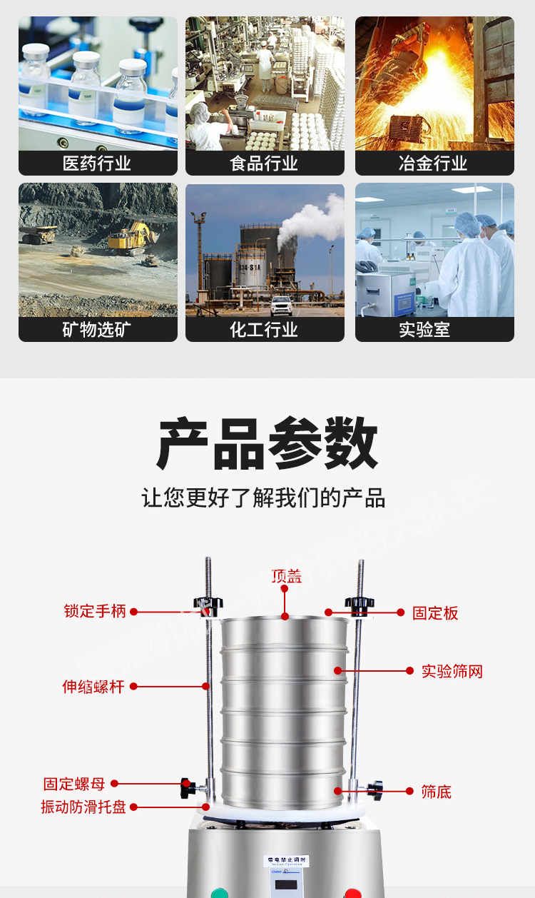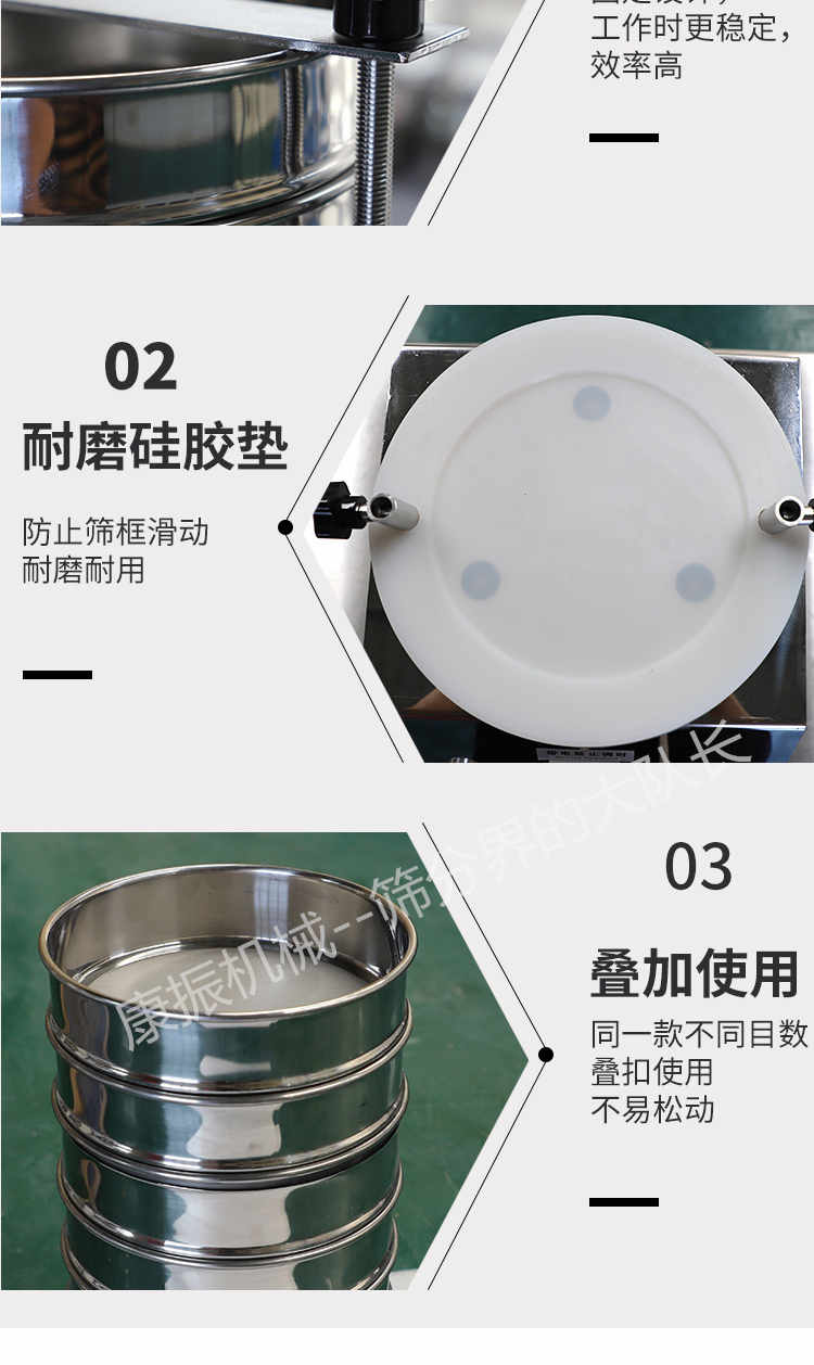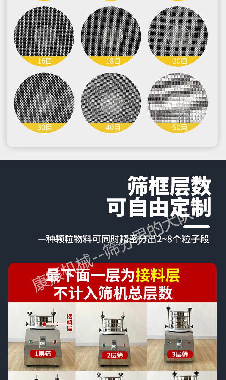 “機械篩分”將篩子按孔徑大小疊在一起,給料放在頂上一層篩子上,并加上蓋和底盤,一般疊5~6個篩子。然后放在機械振篩器上進行機械振動篩分。通常,振動時間為20分鐘。檢測篩分質量時,再用振篩器振篩器振篩5分鐘,如每分鐘篩下量小于0.2%試驗樣量即為合格,對于粗粒物料,過篩率小于1%即可。如篩分過程中損失量超過總篩分量的0.5%時,試驗必須重新取樣進行。為避免損失和延長篩分時間,有時在開始篩分時先用細的篩子將粉塵篩除