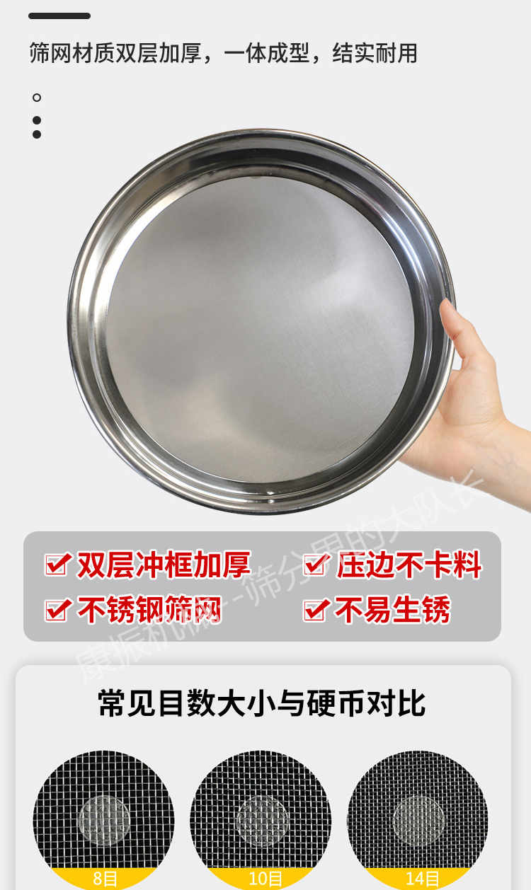標準檢驗篩(試驗篩)又叫標準篩,是具有標準篩孔的篩析工具,又是檢驗其他粒度檢測方法的工具或依據(jù),實驗室篩分所用的篩子是按表中有關標準制成的篩孔大小不一的試驗套篩,即標準篩。標準篩是由直徑15~450mm,高為25~50mm的篩框和篩網組成。篩框不銹鋼板制成,實驗室篩分用套篩是一個篩子套在另一個篩子上疊成的。上層的篩孔大,下層的篩孔小。上部加一個蓋,下部加一個底盤,以減少灰塵和損失。底盤還用來承接通過后一個篩子的細粒級產品。