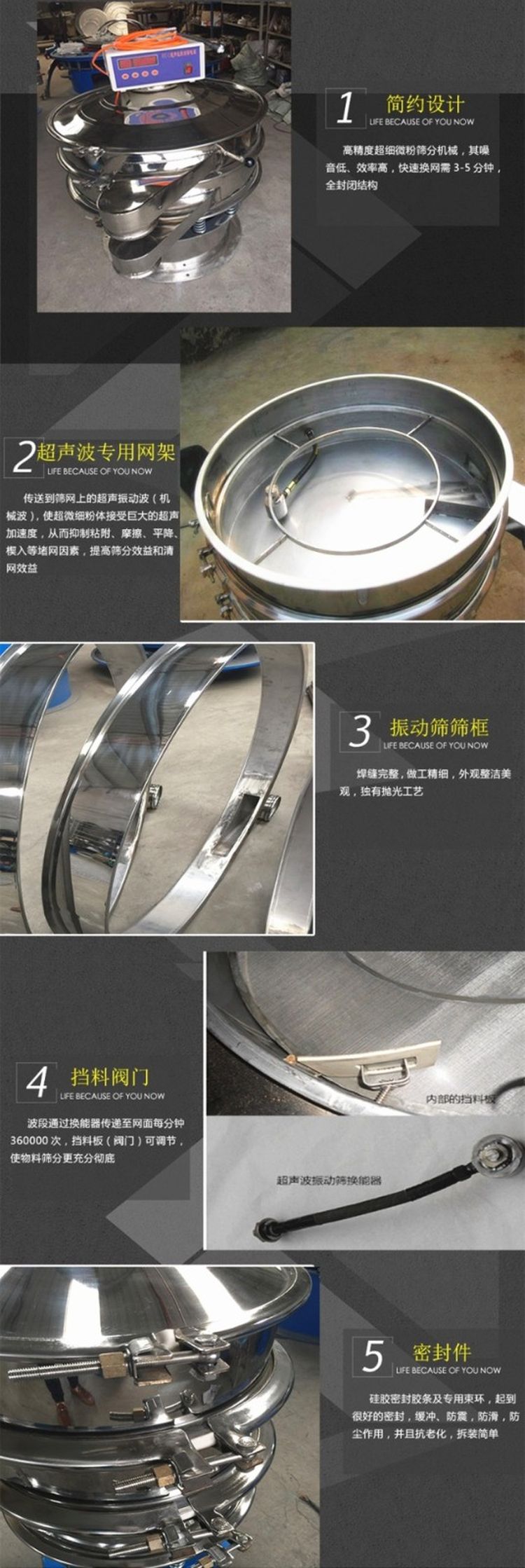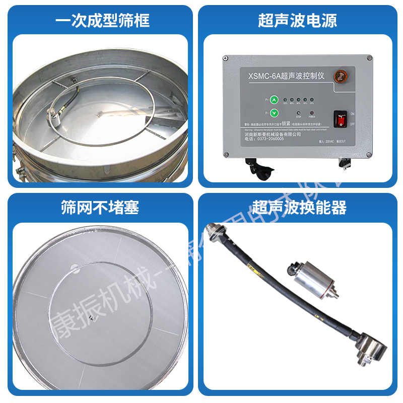 超聲波振動篩是將220V、50Hz或110V、60Hz電能轉(zhuǎn)化為36KHz的高頻電能,輸入超聲換能器,將其變成36KHz機(jī)械振動,產(chǎn)生的功率超聲波使篩網(wǎng)作高頻振動。篩網(wǎng)上的物料在作低頻旋振運(yùn)動的同時,疊加上超聲振動,既可防止網(wǎng)孔堵塞,又可使篩分機(jī)提高產(chǎn)量和質(zhì)量,從而達(dá)到快速篩分和清網(wǎng)的目的,使超微細(xì)粉篩分成為易事。該系統(tǒng)在傳統(tǒng)的振動篩基礎(chǔ)上在篩網(wǎng)上引入一個低振幅、高頻率的超聲振動波(機(jī)械波),以改變超微細(xì)分體的篩分性能。特別適合高附加值精細(xì)分體的用戶使用。
