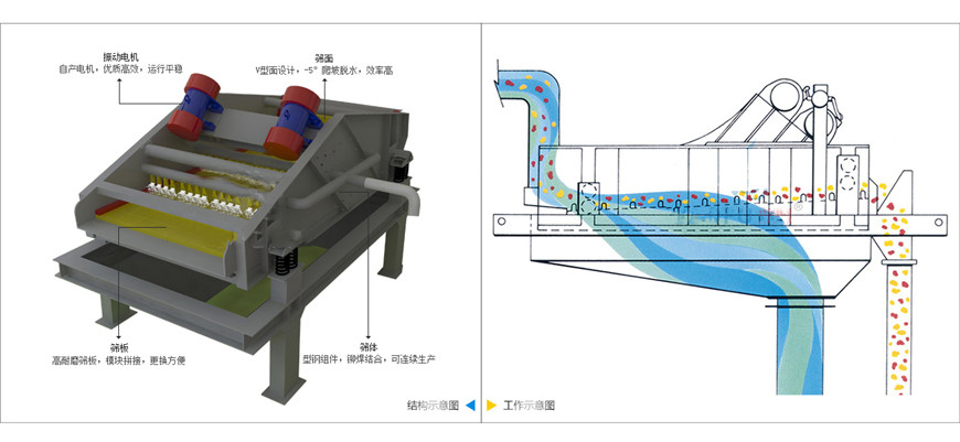 脫水篩又稱高頻脫水篩,通過激振力改變了礦漿表面的水張力,漿水透過篩網(wǎng)成為篩下物,而微細(xì)物料被篩網(wǎng)阻隔形成濾層受振動(dòng)力影響向前運(yùn)動(dòng)排出。脫水篩主要用于選礦行業(yè)的尾礦脫水、選煤廠的煤泥脫水、水洗石英砂脫水和陶瓷泥漿脫水,以及電力、制糖、制鹽等工業(yè)部門對(duì)中細(xì)顆粒物料進(jìn)行干濕式分級(jí)、脫水、脫介和脫泥。