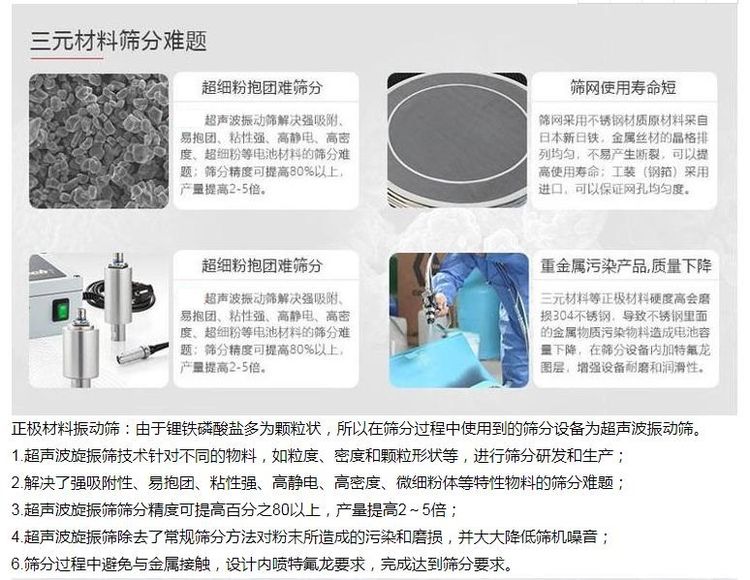 由于超聲波振動在新能源行業(yè)的**表現(xiàn),在線清網(wǎng)效果明顯,對于比較難篩分的物料有其顯著的效果。