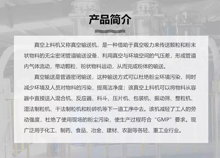 ZKS系列真空上料又稱真空輸送機,是通過氣體產(chǎn)生真空輸送粉體料的設備,是氣體輸送的一種。適用于醫(yī)藥、食品、化工、冶金、建材等多個行業(yè),針對各種粉體物料的密閉輸送,提高物料的潔凈度,能滿足不同客戶的多種輸送需要。